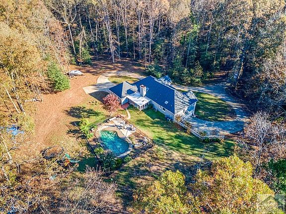 Your own private retreat, nestled back in the woods on 5+ acres with a pool! This beautiful home has the privacy you crave with all the room you'll need, including 2, two-car garages! Grand 2-story foyer entrance. Vaulted great room with exposed beams, beautiful stone fireplace and a second sitting area. Bright and airy sunroom is located just through the double french doors off the great room. The eat-in kitchen is open and spacious, with plenty of cabinets and an island with breakfast bar. The huge owner's suite is truly a retreat featuring a jetted tub, separate shower and 2 vanity areas all with its own private entrance and deck. Entertain family and friends in your private backyard with an in-ground pool for all to enjoy!