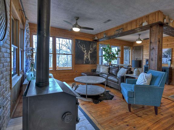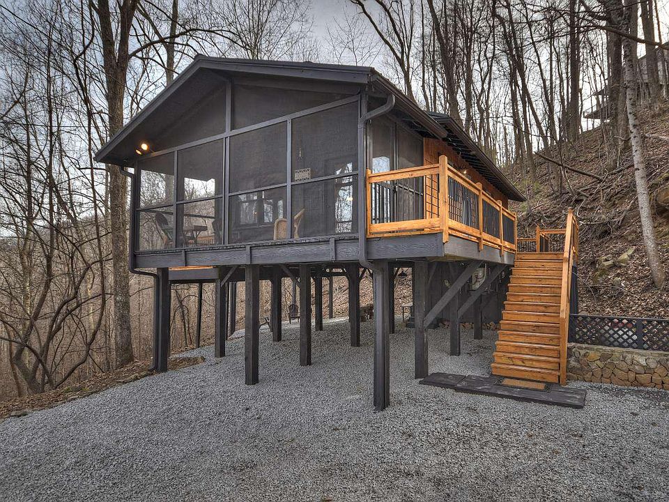 Unique Treehouse with Year Round Mountain Views! This Adorable 2BR/1BA Cottage style home has been completely remodeled! This Charming Treehouse Features Open Concept Living/Kitchen/Dining with wall of windows taking in the Mountain Views, Spacious Master Bedroom with Private Deck, and Tons of Outdoor Living Space with Full Length Front Porch, large separate screened in porch, and Huge Outdoor Living Space Under the House! Completely Renovated with New Metal Roof, Decks, Partial Siding, Interior/Exterior Paint, All New Lighting, Mini Split Air/Heat Unit, Vent Hood, Refrigerator, Flooring, and Tons More! Couldnt find a better property for this price!!