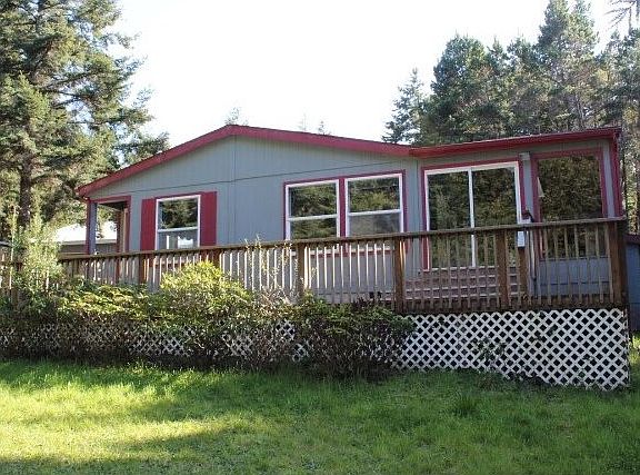 Coastal Escape! 1.14 acres with 1997 manufactured home. 2 bedrooms, 2 bathrooms open concept main living area with vaulted ceilings, sunporch(sunporch not included in sqft) and attached garage. Detached oversized 4 bay shop/garage, circle driveway and large yard add to the appeal of the home.