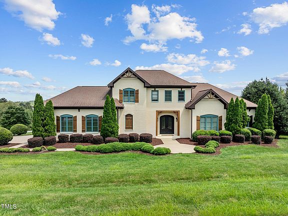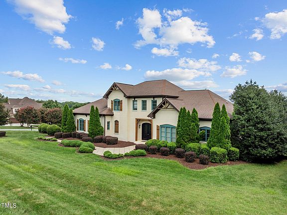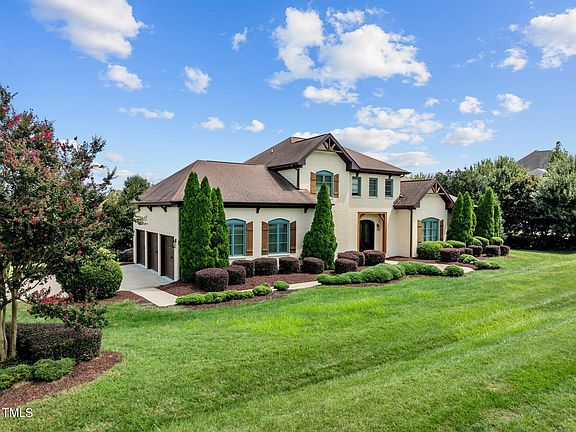 Welcome to 1189 Stone Kirk Drive Raleigh, NC... Once you drive into this prestigious subdivision of the Registry and wind down its beautiful streets you'll find a gorgeous, rustic, Spanish-inspired estate. With architectural details like wooden beams, custom shutters, and double hinged iron door. This property exudes luxury from the moment you see it. With an open concept main floor living plan, the layout lends itself to entertaining both on the interior and exterior. The dining room is open to both the expansive kitchen and family room. The interior main hallway has a travertine-esque tile floor and large wood shutters. It's reminiscent of Bahamian architecture found on a beautiful exotic island. The chef's kitchen has a large island and bar/prep area with honed marble countertops. The custom cabinetry has soft close drawers including one with a pull out trash bin. The secondary area is a perfect prep sink or breakfast bar. On the first floor you'll find a drop zone from the 3 car garage entrance and a large laundry room with sink, washer and dryer and new quartz countertops. The music room/study has large windows and a separate entrance to the exterior patio areas. This room is in addition to the executive office located at the front of the residence. On the other side of the home and also on the first floor, you'll find the primary suite. With lots of windows, this space is filled with natural light and it too has its own door to the exterior. The primary bath features a large dual vanity, soaking tub and separate water closet. Upstairs are three bedrooms, each having access to a bathroom. There is a large bonus room with a half bath at the end of the second floor hall; a great spot for a gym, yoga studio or theater. This home has no shortage of storage space. With lots of cabinetry in the kitchen, laundry room and baths; there are also large finished and unfinished storage areas. The walk-in unfinished space is very large, almost 1000 sq. feet. The grounds of this home are landscaped and manicured with flowering plants and evergreens. Enjoy evenings on the rear open covered porch, sitting under the ceiling fan, enjoying the outdoor television or sitting peacefully by the fire. Gaze out onto the rolling hills of the backyard and realize the beauty of North Carolina living.