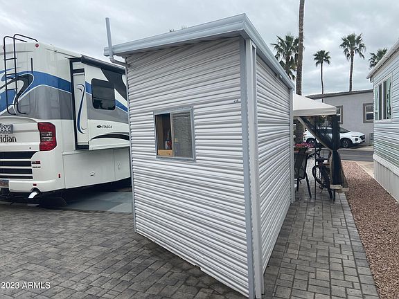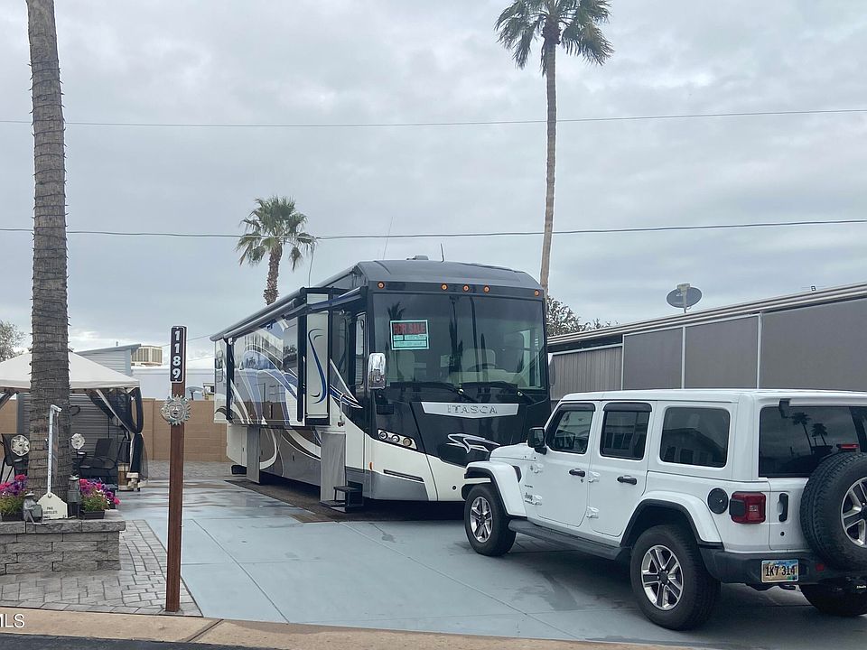 Here is the RV lot you have been looking for! Large enough to park the biggest motor coach or the perfect location to build your exceptional winter home! This lot will not disappoint! Spacious shed with washer/dryer! Gazebo is included and all patio furniture. Nicely finished with a mixture of cement and pavers. Drip system in place to water your winter flowers at the roadside! North/ south facing for the perfect mix of sun and shade in the best RV park in the valley! This lot is easy in and easy out! Come enjoy the Arizona sunshine!