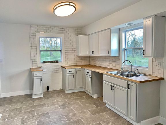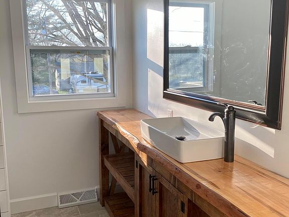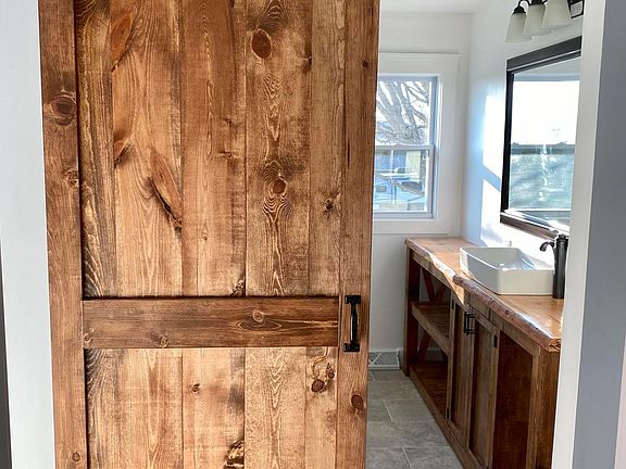 This newly remodeled home sits on a hill and has a great view! Original hardwood floors have been refinished and look amazing! NEW white trim, white doors, black hardware! The original bathroom and kitchen have been gutted and include a NEW distressed barn door, a deep bathtub, white subway tile, plank tile floors, a modern farmhouse sink and oiled-rubbed bronze faucets! The long vanity cabinet was custom built and includes a unique maple slab counter top! Farmhouse kitchen includes two-tone painted grey and white cabinets with a butcher block countertop. All new stainless steel appliances (coming soon), large plank tile and shiplap walls create a bright kitchen! A $25,000 basement makeover includes drain tile, sump pump and waterproofing with a warranty. New deck and landscape. Continued-