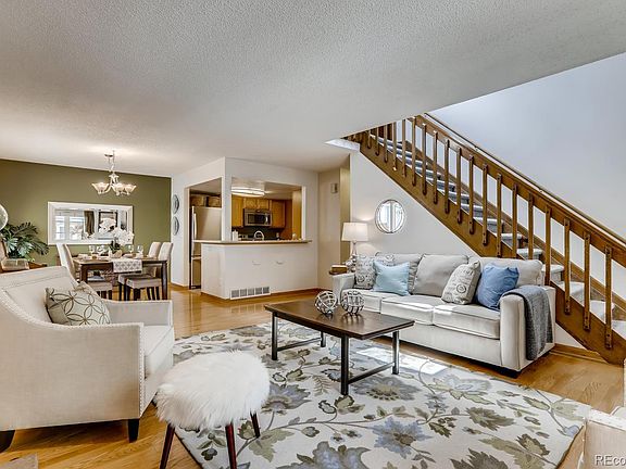 This is a low maintenance single family patio style home with HOA amenities including a pool and tennis courts. Updated 5 bedroom, 4 bathroom with natural wood floors, gas fireplace, main floor bedroom/office + 3 additional bedrooms upstairs. The large kitchen has plenty of storage, corian countertops, and stainless steel appliances. Master bedroom has walk-in closet, vaulted ceilings and an en~suite master bath with soaking tub. The two additional large upstairs bedrooms have their own full bath. Home features newer windows, water heater, furnace and air conditioning. HOA includes exterior structure; roof and exterior paint new in 2018. There is a large deck off of the dining room that is fully fenced and great for entertaining. Large unfinished basement for extra space or finish to your liking. Easy walking access to the "Point At Nine Mile Station", which has a brand new King Soopers and a proposed development for a pedestrian bridge to the light rail. Close to major transportation, highways, shops/dining/parks and medical centers. **3D Matterport Tour Available**