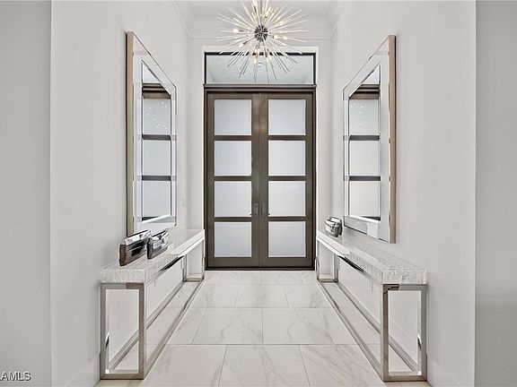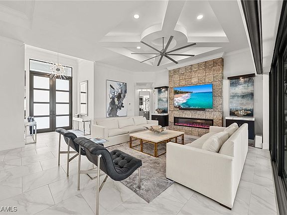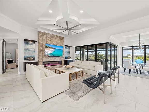 Located in the prestigious golf community of Cape Royal, this 2022 custom-built home showcases modern elegance and luxury at its finest. Decorated with Bernhardt and Century furniture, mixed with exquisite lighting fixtures and distinctive artwork - each piece tastefully enhances the beauty of this home. Accented with QUARTZ COUNTERTOPS in the kitchen, bathrooms, laundry room and WALK-IN CHEF'S PANTRY, coupled with an oversized quartz waterfall kitchen island and white porcelain farmhouse sink, tie everything together. So many features included in this home: A 500 GALLON PROPANE TANK THAT OPERATES THE STOVE, OUTDOOR GRILL, HOT WATER TANK, POOL HEATER AND WHOLE HOUSE GENERAC GENERATOR. THE HALO 5 WATER SYSTEM, BRIDGEWOOD CABINETRY, THERMADOR APPLIANCES, DRY BAR, DESIGNER LED BATHROOM MIRRORS, OVER-SIZED CROWN MOLDING, BASEBOARDS AND TRIM ARE EXCEPTIONAL! CUSTOM CEILING DESIGNS, 90-DEGREE SLIDERS WITH CUSTOM REMOTE BLINDS IN EVERY ROOM AND A 72" ELECTRIC FIREPLACE CREATE A STUNNING AMBIANCE! The lanai boasts a CYPRESS WOOD CEILING, A full SUMMER KITCHEN WITH GAS GRILL, STORM SMART BLINDS, FULL CONCRETE POUR-UNDER PAVER POOL DECK, SUN SHELF AND PANORAMIC SCREENS to fully capture the golf course and water views! All HURRICANE IMPACT DOORS AND WINDOWS, TILE ROOF, 3-CAR GARAGE, INSULATED FLUSH PANEL GARAGE DOORS AND FLORATAM LAWN make this home truly astounding.