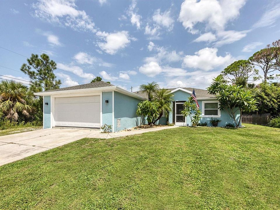 Paradise is calling and this 3 bedroom / 2 bathroom single family home is the answer! Located in Englewood, FL, where watching sunsets on the beach and having sand between your toes is a normal thing. You are just 8 miles to the beach, 2 miles to the nearest golf course, and 1.7 miles to the grocery store; But you wouldn't know it - the neighborhood and street is so quiet! This 2006-built home is in an X flood zone, so no requirement for flood insurance! And NO HOA or deed restrictions, so enjoy your privacy fence and shed (included!), and the ability to park your RV alongside the home. The home has a convenient covered and screened front entry, with a gorgeous lead-glass door leading to the private entry hall. A spacious tray-ceiling great room meets you (living and dining areas), with tray ceilings and a sliding glass door to the back screened lanai. There's a convenient pass-through from the kitchen to the dining area. The kitchen has wood cabinets, a closet pantry and additional shelving for storage, plus room for a dinette table. This is a standard "split floor plan" with the primary bedroom on one side of the home and the additional 2 bedrooms on the other end of the home. The primary bedroom has a tray ceiling, spacious walk-in closet and full bathroom with walk-in shower. The additional bedrooms are on the opposite side, both near the second full bathroom with tub and shower. Enjoy time out back in your screened and covered patio, while you BBQ and get some sunshine on the extended patio. The above ground pool is perfect for floating for the adults, and fun for the kids. (Seller will remove the pool if the buyer does not want it). The garage had been built-out but has been converted back so could be used for extra work space or as a garage. Laundry appliances are currently in the garage but could be hooked up inside the home where the shelving/storage is. Bonus is IMPACT WINDOWS, NEW AC, public water and septic. This would be a great family home (Myakka River Elementary / LA Ainger Middle School / Lemon Bay High School), or a great second home for you snowbirds, or even as an investment property to earn income. Don't hesitate; Paradise is calling!