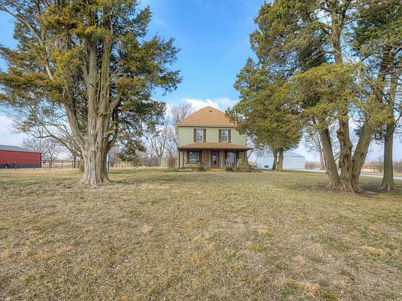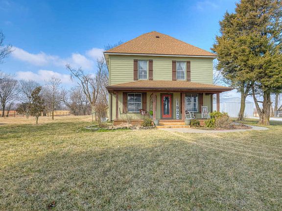 You must see this unique 3-bedroom, 2-bath updated farmhouse sitting on 11.35 scenic acres with a pond and in-ground swimming pool. The property is completed by a 30x50 shop with built-in cabinets & workbench, loft storage, drive-through doors, and a large Atlas storm shelter. A great patio between the house and the fully-fenced-in pool will be perfect for entertaining on upcoming warm summer evenings, and the large covered front porch is the perfect spot to sip coffee and swing! Inside this historic home, you'll find two living areas and two dining areas - one formal and one informal. The kitchen is the heart of the home, featuring painted white cabinets, stainless steel appliances, granite countertops, eat-at bar, large island, open shelving, and a beautiful stamped tin and