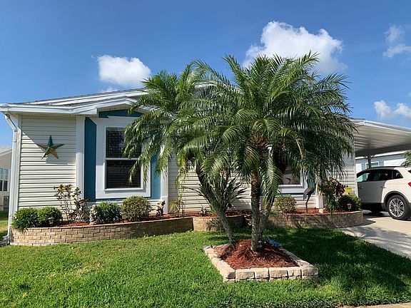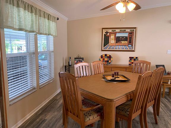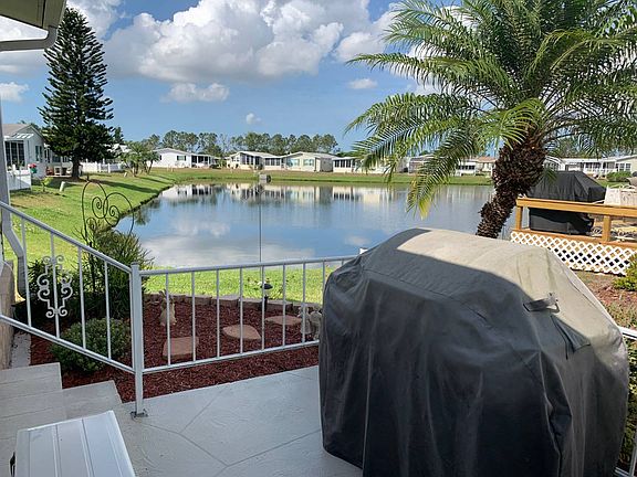 This is a mobile home for sale in a 55+ community on a rented/leased lot. This rare 3BR/2BA 2002 Palm Harbor is an oversized double wide that feels like a triple wide! It has a split bedroom floor plan. There is over 1,900SF for living, dining and entertaining including a lanai and enclosed porch with water views. The home comes partially furnished. Some updates include 2019 kitchen appliances, newer A/C and air ducts; newer roof; newer washer/dryer; newer high top toilets; newer thermo-pane windows; newer acrylic slider lanai windows, newer durable 12 mil water resistant wood laminate flooring and a security system. This home is an open living room/dining room/kitchen combination with 8" laminate floors, smooth walls, custom paint, vaulted ceilings and crown molding. The galley style kitchen is a Chef's delight and has ample countertop area, a food pantry, a buffet service hutch and custom cabinets with dental crown molding. There is a closet off the the casual dining area for housing the washer/dryer (included in the sale). There is an 17 x 11.5 enclosed glass porch adjacent to the casual dining area with a separate newer Mitsubishi split a/c unit. This light, bright, enclosed room has a sweeping view of the water and exits out the back to a patio for grilling. The formal dining area and living room has 8" laminate floors, 2 inch blinds, vaulted ceilings, ceiling fans, custom paint and crown molding. The master bedroom has laminate flooring, a ceiling fan, a walk in closet, custom paint and vaulted ceilings. The master bathroom has a dual sink vanity and a walk in (enclosed) shower with floor to ceiling custom tile. There is a sliding glass door exiting onto a 11 x 10.5 screened lanai with views of the water. There is a separate door into the enclosed glass porch area, making for a large ongoing outside area for living and entertaining. The 2nd and 3rd bedrooms have carpet, 2 inch blinds, ceiling fans, vaulted ceilings and extra closets for plenty of storage. The guest bathroom features a single sink vanity, 12" ceramic tile, a skylight, vaulted ceilings and a tub/shower combination. The home has tandem style parking for up to 3 cars. There is a shed with double entry doors for golf cart parking and extra storage. The lot rent is $778 a month and includes lawn mowing, edging and blowing, cable TV and all the community amenities below: Spa Whirlpool Horseshoes Tennis Court Shuffleboard Court Billiard Room Library Fitness Center The Gardens MHC is located within walking distance of shopping and other services. It's close to I-75 for easy access; and far enough way not to hear the it! The Gulf beaches are but 15 minutes west...