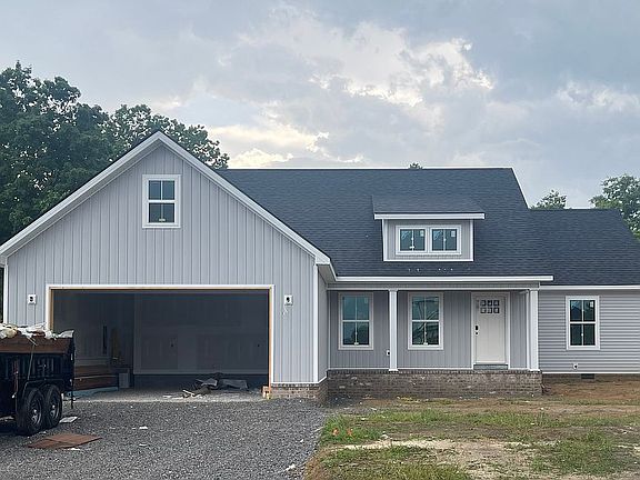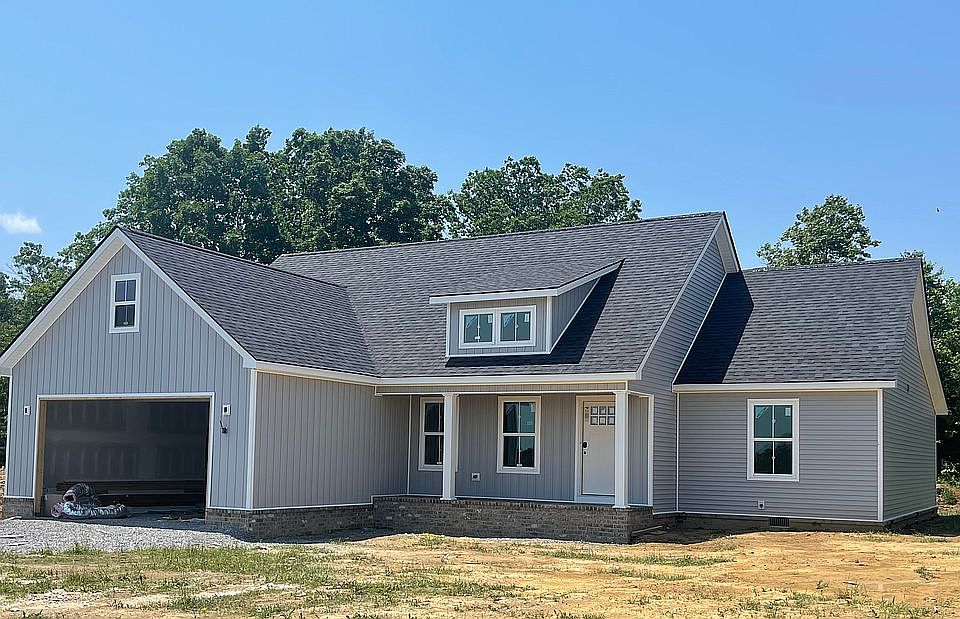 Popular farmhouse plan with board and batten siding located in Boyle County. 3 br 2 bath customized with a larger rear 12ft by 21ft covered rear stone stamped concrete patio and larger spare bedrooms. Soaker tub with a custom tile shower in the master bath. Open floor plan with a hidden kitchen pantry, shaker style cabinets with granite tops along with a vaulted ceiling in the great room and a tray ceiling in the master bedroom. The front and rear porches are upgraded with stained wood tongue and groove ceilings. Photos of the kitchen are of this same house previously finished out. Scheduled to be completed around June 15th. Currently listed at a for sale by owner price of $324,900. It will be listed with an agent on 6-3-21 and the price will increase to $339,900 if not under contract on or before that date.