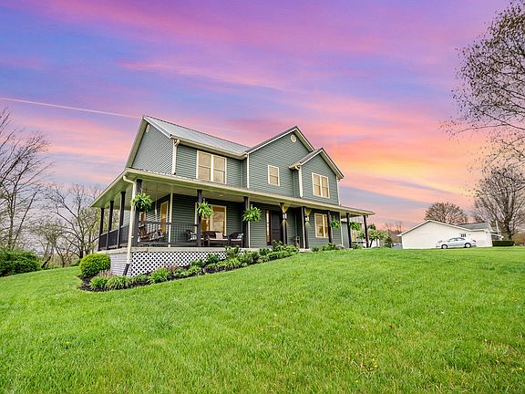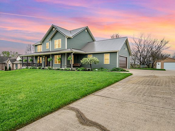 Location at its finest on almost 1 full acre. Luxury and quality living with the custom feel without the custom price. Located 2.7 miles from the interstate, eating and shopping, come experience the beauty and detail this loved home has to offer. First floor primary bedroom with gas fireplace and walkout to ENORMOUS wrap around front porch (54' W x 3 ', 5', 7' 12' ). First floor features red oak hardwood flooring with flush floor vents, 3' wide solid wood doors (wheel chair accessible) and detached 3rd car garage. Just about every aspect of this masterpiece has been updated since original construction in 2004. Smooth Ceilings! New metal roof and gutter guards (2020), new siding, new double hung windows with child safety latches, new exterior doors and front porch railing, new furnace and A/C all in 2020. New deck with solar post lights in 2021. Quartz kitchen countertops installed in 2022. New garage doors (extra wide garage space 20x24) and hot water heater in 2023. Tech updates such as programmable thermostat and LED lights installed inside and out. BEAM central vacuum system. Home backs up to a dry creek bed. Stunning views of a horse farm behind property.