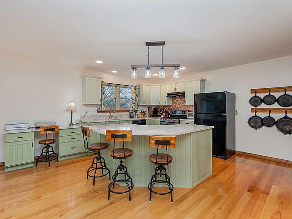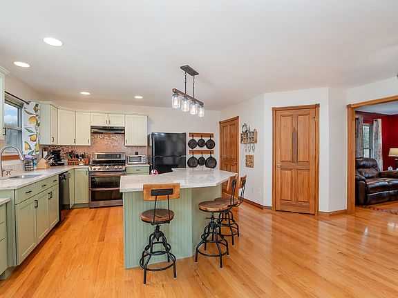 - Features: Walk-Out Access, Wood Flooring, Kitchen Island, Eat-in Kitchen, Pantry, Wood Cabinets, Solid Surface Counters