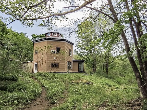 This captivating octagonal house blends seamlessly into its surroundings while offering a peaceful and secluded haven mere minutes from the vibrant MidCoast town of Rockland. As you step inside, you'll be greeted by the warmth and character of this carefully crafted home, featuring high ceilings and an open-concept living area, perfect for both entertaining or relaxing. A toasty sunroom with floor to ceiling windows gives you the perfect spot for relaxing with a good book, a morning yoga routine, or even a hot tub! The second floor holds the two light-filled bedrooms, and one more floor up gets you to the ultimate blank-canvas space. A truly special room that needs to be seen and felt in order to fully appreciate the potential that it holds.