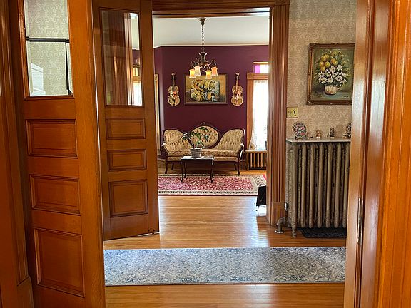 MOTIVATED SELLERS! Located just off of beautiful Main Street is this 1892 Grand Lambert Packard Victorian. Within walking distance to St. Johnsbury Athenaeum, Fairbanks Museum, St. Johnsbury Academy, elementary schools, churches, the Post Office, the local Farmer's Market, and more, this home's location is not the only aspect that makes it desirable. From pocket doors and formal parlors, to original stained glass & woodwork, the historic character offers the beauty you want to see while the improvements offer the assurance of quality that you want to feel. Enter the home from the picturesque covered front porch. The main level boasts two formal living rooms, a foyer, a formal dining, a half bath, an updated kitchen & dining area, and a sunroom. There are two staircases to bring you to the second floor, which offers four bedrooms and 2 & 3/4 bathrooms. The primary suite bestows its own full bathroom with direct access to a walk-in closet and laundry room. The fully renovated third floor offers privacy for guests, provides an office space, has a full bathroom and bonus rooms to use however you please. Step off of the back covered porch onto a patio landscaped with pavers, and into the fenced in back yard, offering privacy for entertaining or containment for pets. A video tour is available upon request. This turnkey home is one of a kind and ready for its new owners.