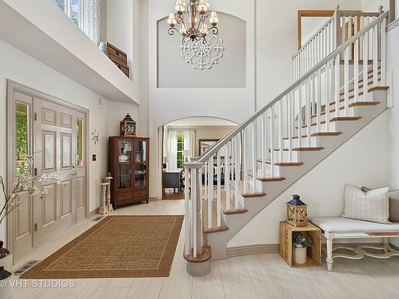 This Gorgeous Belmont in Barrington schools will knock your socks off. This stunner is nestled into a premium lot backing to the woods and siding open space, it's one of most prime lots in the neighborhood. Large, full front porch beckons you to sit and relax a bit, surrounded by family and friends. The 2-sory Foyer is elegant and welcoming with a center staircase, decorator niches gracing the walls and a 2nd story ledge. The Living Room and Dining Rooms are elegant in design with hardwood flooring, crown molding, arched entry ways and a tray ceiling in the Dining Room. A first floor office is quietly tucked at the rear of the home & could be used for a guest bedroom if needed, elegant updated Powder Room is adjacent. The Family Room is expansive in design, yet cozy too! The focal point gas fireplace has built in bookcases to the side and flanked by gorgeous windows. Crown molding and the chandelier add elegance. The design is such that there is an entertaining granite bar on the side of the Family Room for extra seating on game days! There is also a full breakfast bar on the opposite side of the Kitchen. The enormous Kitchen was completely remodeled with varying height custom soft close cabinetry w/ crown molding, roll out drawers, tumbled marble backsplash, granite counter, task lighting, rich, creamy color island cabinetry, a beverage center, 2 separate counters for seating & a large walk in pantry. The very spacious sun-drenched Breakfast Room has a triple slider door to the private paver patio. The first floor Laundry Room has lots of cabinet and counter space and the side entrance door is located right off the Kitchen with a 2nd rear staircase tucked here for convenience. Sumptuous Primary Bedroom with separate sitting room, solid cherry custom barn door and 2 separate walk in closets. Sun-lit bath with 2 separate sinks, whirlpool tub and separate shower. All additional bedrooms are very large with great ceiling lines and closet space. Fabulous set up in the remodeled hall bath - dual sinks, tub/shower with custom tile surround and compartmented design with toilet and a 2nd shower in it's own room! Basement has great space to spread out and includes a large Recreation room and game table area, there is also a study area and built in game storage niches. Additional storage or expansion space as well as rough-in for a bathroom. This setting is unmatched as it sits on a prime lot in the neighborhood with woods as your backdrop and an open huge (detention) green area next door. The free-form brick paver patio is a great escape place where you can enjoy the nature and privacy this lot affords under the shade sail. An added bonus is the warm/hot water spigot on side of house for washing the dog or filling a kiddie pool! This subdivision is wonderful as it has sidewalks, a park and play area and soccer field. The detention pond immediately next door is a neighborhood favorite for sledding. Fox River Grove is now a golf cart friendly town and you are minutes to the Metra as well as attending the sought after Barrington schools. Good Shepherd hospital is minutes away as well. You can put a bow on this total package! Exclude: Garage refrigerator & free-hanging mirrors in Primary bathroom & decorative string lights on front porch and back patio.