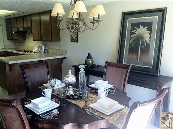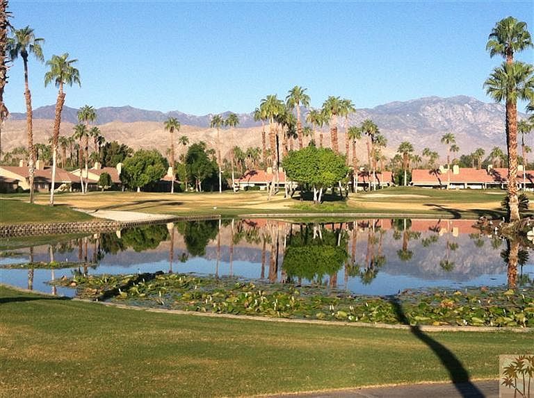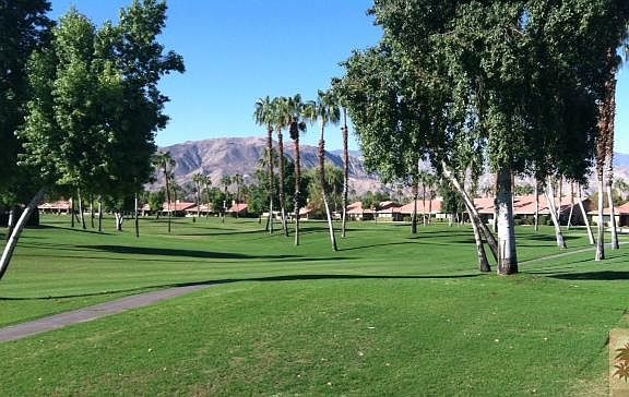 Do you like southern golf course views with swaying palm trees and mountains in the distance? That's the view to the right. The view to the left is the golf course, palm trees and pool/spa. Does it get any better? The back patio has been pushed out with a knee high fence on the perimeter. Interior has some rooms that are original (kitchen) and others that have been remodeled with new carpeting and warm paint tones. Just enough to allow you to put you own touch on it!