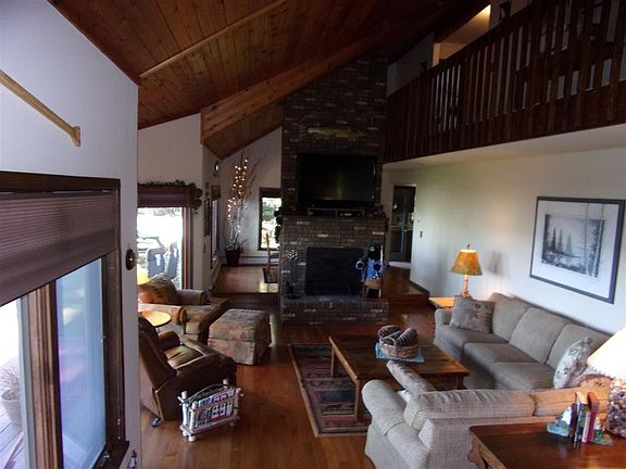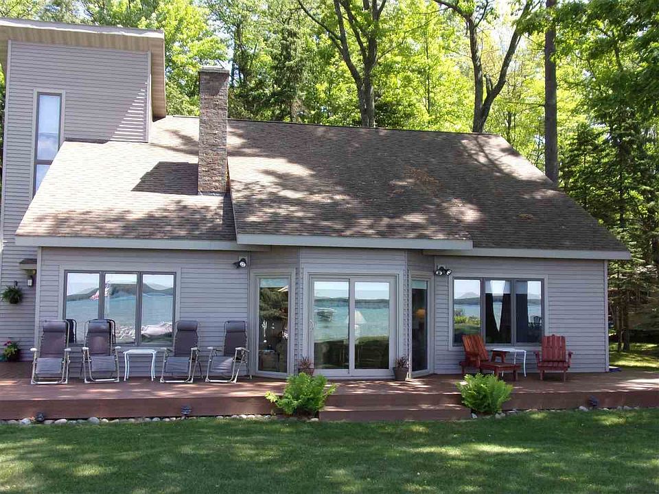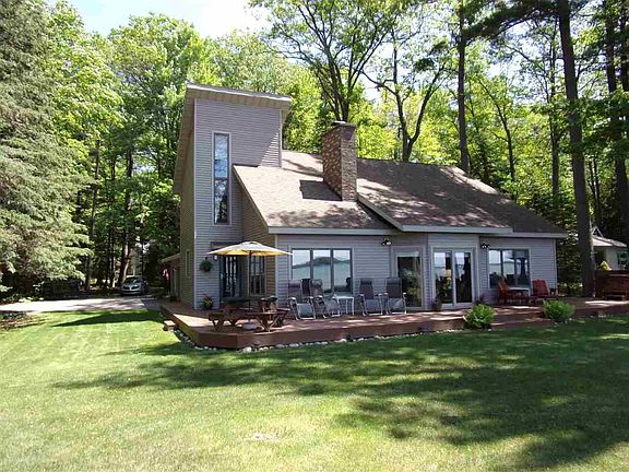 HIGGINS LAKEFRONT: 120 feet of gorgeous lake frontage with remarkable privacy on the northeast shore. Beautifully maintained 4 bedroom home featuring vaulted cedar ceiling in living area with fireplace and walls of glass overlooking the lake, great floor plan and a genuine lake home charm. Granite counter tops, stone back splash and island in kitchen. Hardwood flooring throughout the main floor. Extensive composite decking highlighted by a hot tub, attached 3 car garage plus detached garage that can accommodate 4 cars, concrete driveway and parking area.
