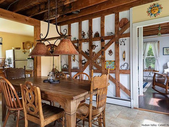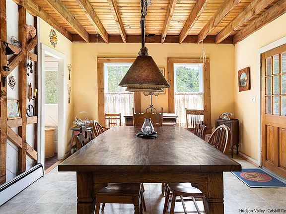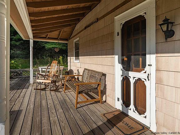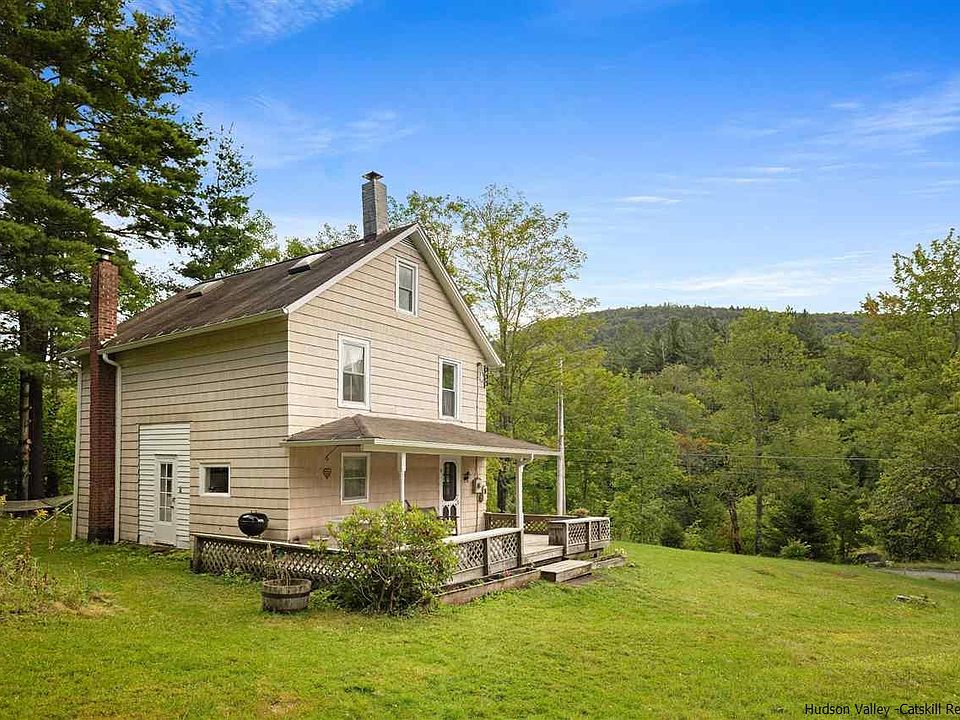Charming 1900 farmhouse with a lovely covered porch sits on a sweet wooded lot just down the road from the beautiful and popular Colgate Lake! Step onto the large covered porch which is the perfect spot on the property to take in the mountain view and the sound of the East Kill Creek which flows by just across the road. Enter into the home's dining room with its warm wood beam ceilings which leads through to a quintessential country kitchen complete with vintage range which faces the back of the property and the woods beyond. On the other side of the dining room, you'll find the living room which features more exposed beam ceilings, charming built-ins, and a cozy Jotul wood stove which is the focal point of the room. Upstairs are three very quaint bedrooms with painted wood floors (the larger of the three bedrooms faces that mountain view!) and the home's ample full bathroom with vintage fixtures and clawfoot tub. The attic provides bonus space for work or play and enjoys bright natural light from its skylights and windows that capture more of the view. Outside, a 300 sq ft barn shed is great for storage and a small garden off the kitchen door is the perfect spot for growing flowers and veggies plus there's even a small apple orchard of 6 trees! In the heart of the Catskills in East Jewett, this home is just minutes to swimming and kayaking on Colgate Lake, 10-15 minutes to shops and restaurants in Tannersville, Prospect Restaurant and Bar at Scribner's Catskill Lodge, skiing in Hunter and Windham, hiking in nearby wild forests including Kaaterskill Falls, and less than 2 hours to NYC.