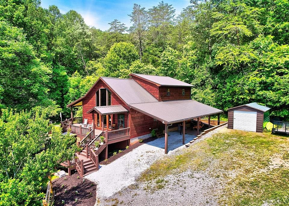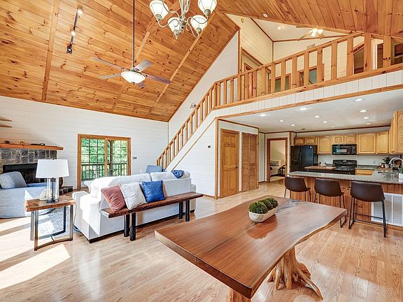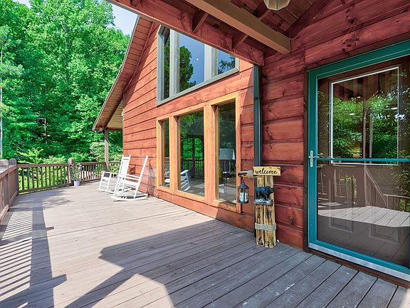 One-of-a-Kind -Your Mountain Lifestyle Awaits! This 4-bedroom, 3.5-bath, three level 2940 sq ft cabin isn't like the rest-buy the home and embrace the Blue Ridge lifestyle! Sitting on 2.2 acres of flat, usable land, this mountain retreat is just 3 minutes from Old Toccoa Farm's premier golf and social club and steps from world-renowned trout fishing at ancient Indian fish traps. Only 3 miles from iconic Mercier Orchards, and 5 miles to town-enjoy convenient access to golf, hiking, fishing, shopping, and more! The main level features a spacious open-plan living/dining area with dramatic floor-to-ceiling picture windows and a cozy gas fireplace-perfect for relaxing after adventure-filled days. The private oversized master suite with a jetted bath, his-and-her vanities and shower features sliding glass doors leading to the covered porch. Wraparound wooden decks offer private tree views from three sides, showcasing bountiful wildlife, and abundant birdlife including hummingbirds and cardinals. The upper level boasts an open loft with a two-person electric sauna featuring infrared lighting-this space is ideal for extra sleeping, an office, or additional private guest retreat. You'll be amazed by this 2nd master bedroom with a private spacious deck, accessed via glass sliding doors, which overlooks the backyard with nature views. The carpeted terrace level includes a spacious open living/game room with a refrigerator, storage, and an oversized bunk room sleeping 8. Additionally, there is a large, insulated toy /entertainment shed with electricity which is ideal for storing outdoor toys. This updated home features exterior cedar wood. All decks have been professionally cleaned and re-stained. New retaining wall at carport area. New gravel terrace and garden wall feature and oversized dropdown party deck with dedicated electrical. New carpet on terrace level. New window wall and extensive yard renovation with multiple fire pit, garden and seating areas for entertaining.