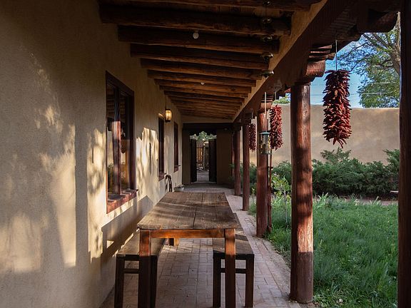 An adobe home & casita circa 1910 that has been updated with all the right touches to compliment the original charm. Hand-carved features can be found throughout the home. A large portal greets you and beckons you to morning coffee watching the many migrating birds that visit. With 8 skylights and many large windows this home has all the natural light you could ever dream of. Cozy up to one of the 3 kivas that adorn the living areas and kitchen. The main house has 3 bedrooms & 2.5 baths. The spacious primary bedroom is illuminated by a large skylight but a solar-powered shade makes it into a cozy den with the push of a button. Right through the French doors in the primary bedroom is the completely remodeled, large bath clad with Cl tile, unlaquered brass fixtures, a large walk-in shower, a soaking tub, a double vanity with marble countertop, and heated floors. The large chef s kitchen, with plenty of storage, has been lovingly updated with all new appliances, a custom maple butcher-block island. This beautiful kitchen is the epitome of form & function. Flagstone paths meander the backyard including a dining patio right off the kitchen, the perfect place to gather on those beautiful summer evenings drenched in sunset. There are many areas for lounging and taking in the mature landscaped yard equipped with an automated irrigation system. The completely renovated casita in the back yard has its own gated entry, and a fence separating it from the main house. There you ll find new white oak flooring, lime-washed walls, a custom kitchen build-out by a local woodworker, new appliances, brass fixtures, a dreamy stone-clad shower, and a new water heater. Private & perfect rental potential. Recent updates include a fresh coating on the roof, a half bathroom addition & laundry room, complete renovation of the en-suite bath, updated 2nd bath, new water heater. Limewashed & plastered walls, and low voc finishes were used throughout to keep the house & casita low tox. There is a 1-car garage with attached shop space. This property is zoned C2 so there is huge potential for a future business. 119 Cruz Alta is private and tranquil while still just minutes from the plaza!