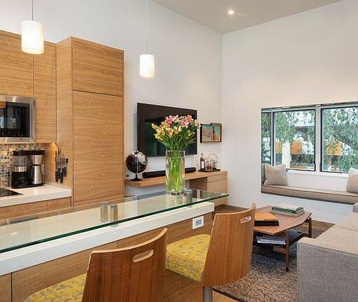 Welcome to a sleek and sophisticated one-bedroom condo in the Core of Aspen. The only unit in the building with vaulted ceilings providing a voluminous and spacious feeling with views of Aspen Mountain. High-end finishes, luxury furniture, and art make this a truly remarkable vacation stay. A fully equipped gourmet kitchen stocked with Le Creuset dishware/cookware complete with Wolf induction cooktop. Two large TVs, Sonos speakers, pull-out couch and a negotiable underground garage parking space. One block to Wagner Park so very easy stroll to the gondola, shops, and restaurants or free Downtowner service through the Aspen app. Approximately 2 blocks to Lift One A. Hot tub and gas grill in the common area. Underground garage parking space/storage is available for an extra fee.