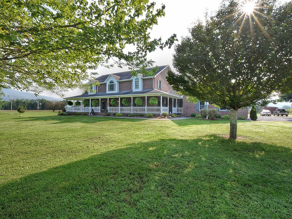 This custom built stately two story brick home sits on a gorgeous level 2 acre lot featuring both mountain and pasture views. The tree lined driveway prepares the way for the gorgeous setting of this home. Entering the home you are greeted by a large soaring two story foyer. Connecting from the foyer you will find a nice office with custom bookcases and a formal dining room. The two story great room features a custom brick fireplace that runs floor to ceiling and has gas logs providing the focal point of the room. The kitchen is directly off the great room and features extensive counter and cabinet space and a nice breakfast nook overlooking the backyard. You will love the space that the main level master bedroom provides that includes a large walk in closet and en-suite master bathroom with Jacuzzi tub and stand up shower. Additionally on the main level is a large sunroom area that is both heated and cooled and has tons of windows to allow for natural light. A beautiful staircase leads to the upstairs overlooking the great room. On the second level you will find four bedrooms, one which could serve as a second level master bedroom in addition to there being two full baths on this level. The two car garage is very spacious and features oversized garage doors and walk up storage space above the garage. This home boasts extensive hardwood flooring, ceramic tile, high end oak cabinetry, warm neutral colors and extensive custom moldings and trim. This all brick home features high quality all brick construction and will stand alone in what it has to offer in both size, quality and amenities in a setting that offers both privacy and convenience. All information and square footage are subject to buyer verification.