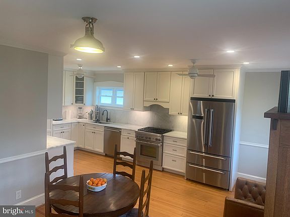 Nestled on a neat little side street within walking distance of the hospital, this cozy home has many updates that buyers will adore! The covered front porch welcomes visitors and is a perfect place to relax any time of day. The large eat in kitchen is the heart of the home updated with an abundance of 42” white cabinets, beautiful, marbled granite counters and stainless-steel appliances. Living room and dining room are adjacent to the kitchen all with hardwood flooring. Off of the kitchen is a newer updated half bathroom perfect for guests. Second floor offers 3 nice size bedrooms and full bath. The detached garage was rebuilt and has a garage door opener. Basement offers plenty of storage . Many newer windows and doors newer metal roof. Washer and dryer from 2021. About 8 minutes to train station.