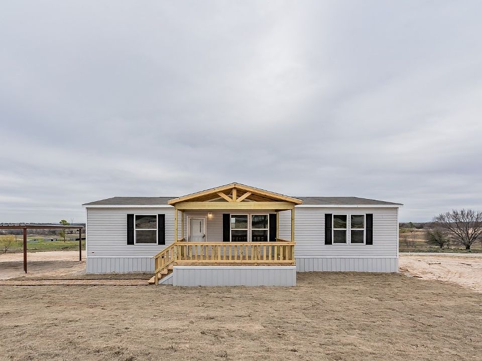 A fabulous 3 bed room 2 bath open concept home on OVER 1 acre! This home sports an open concept which is great for entertaining or anything your heart desires. The kitchen comes with an island, refrigerator, range and dishwasher. There is a large laundry room that has more than plenty of space to hook up a full size washer and dryer. Ceiling fans, recessed lighting, walk in closets and so much more! Your parking needs are covered with a 20x21 carport and a beautiful custom walkway. A beautiful 10x16 covered front deck and a 10x10 back deck. Walnut Creek water, Oncor electricity and private septic. Home comes with manufacturer warranty.