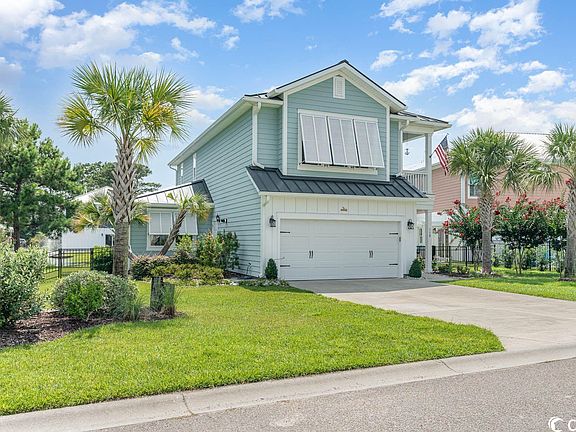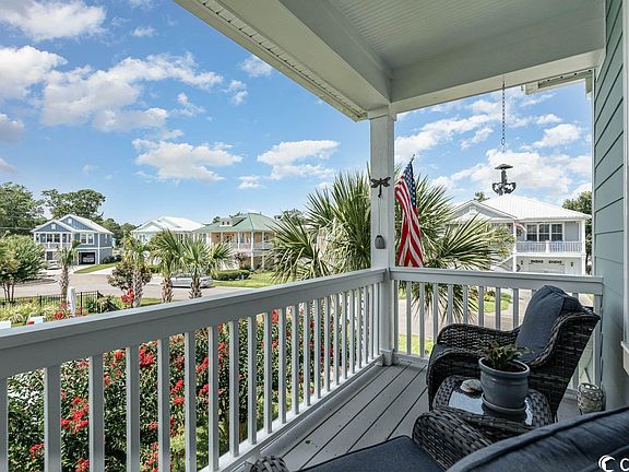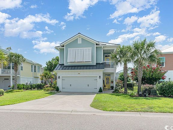 This immaculate Raised Beach Home is in the adorable Reflection Pointe subdivision in Garden City. This neighborhood is only a short golf cart ride away from the beach, restaurants, and shopping. This home is better than "new" with several upgrades added within the past two years, including gutters, new deck off second floor primary bedroom with Trex flooring and stairs with retractable awning, and large covered concrete patio on first floor. Lovely, professionally landscaped front and back yard with many flowers, flowering trees, raised garden, and 5 palm trees. Back yard has wrought iron fencing and backs up to pond for privacy. Full Bahama hurricane shutters on second level and half shutters on first level. This 4BR/3.5BA home is in excellent condition. There is an elevator shaft within the home if you would like to add an elevator in the future. Home has Hardiplank siding, metal roof, and tankless hot water heater. There is a second Primary Bedroom on first floor with tray ceiling, ceiling fan, large closet and its own full bathroom. There are two secondary bedrooms plus another full bathroom in the hall. All bedrooms are carpeted. The rest of the home has laminate flooring. One of the secondary bedrooms has a sliding door out to the rear patio. Large foyer and storage closet on the first level with door to double garage. Wood stairs lead to spacious second level with 10 ft. ceilings and crown molding throughout. Large living room with tray ceiling and ceiling fan. Sparkling kitchen with grey cabinets, large pantry, recessed lighting, granite counter tops, and breakfast bar with pendant lights. All stainless appliances to include: side by side refrigerator, gas stove, dishwasher, stainless undermount sink, and ceramic backsplash. Laundry room with full size Whirlpool washer/dryer and half bath on second floor. Primary bedroom has tray ceiling, walk-in closet, and large en suite bathroom. Bath has large double sink vanity and beautifully tiled stand-alone shower with glass doors. Linen closets in each bathroom in the home. Furnishings are negotiable. Neighborhood pool! Homes in this neighborhood don't last long...show today!