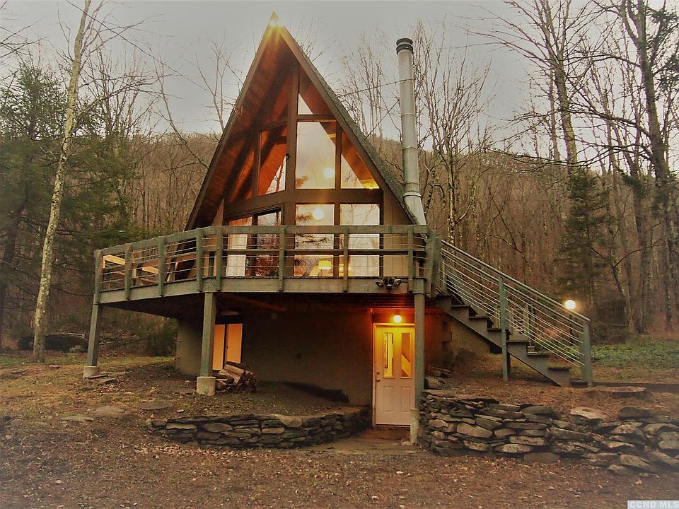New Price! Vintage 1970's Hunter Mt. A-Frame gets a modern day make over completely revamped inside and out offering sophisticated design forward features, important exterior upgrades include a trenched drain around perimeter, spray foam foundation, new roof, replacement windows and expanded decking, environmentally conscience and energy efficient radiant heat system supplemented with Runtal radiators, TOTO commode fixtures and remote Velux sky lights. Finishes include gorgeous black stone granite counter with white Wood mode self closing cabinets and High Profile SS GE appliances. Home tastefully appointed with IKEA and Crate & Barrel furnishings included in sale- nothing else like on the market Year round weekend vacation home walking distance to lodge has great rental potential. Turn key low maintenance getaway you'll be proud to own in the trendy Catskill