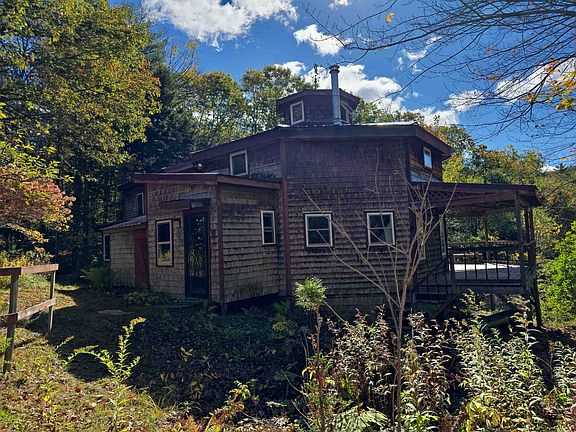 Tucked away on 27.7 wooded acres, this one-of-a-kind home offers the private retreat you've been dreaming of. Lovingly built by the seller’s husband, it blends rustic charm with creative design. The octagon-shaped main living areas are spacious and light-filled, with a cozy loft tucked beneath a cupola crowned by a whimsical flying pig weathervane. The rest of the home offers contemporary touches and thoughtful surprises throughout. Step outside to enjoy the wraparound rear deck that overlooks scenic gardens and trails ready to be reclaimed. A large outbuilding provides space for tools and toys, and a quaint potting shed is perfect for garden lovers. The land also offers potential for a glamping-style retreat or private campground with town approval. Located near a variety of year-round recreation—enjoy hiking, boating, swimming, skiing, and snowmobiling just minutes away. Stay connected with underground power and Fidium fiber internet, and enjoy added peace of mind as this home is wired for generator backup. This unique, tranquil setting is ideal for full-time living, weekend escapes, or a creative homestead all within easy shopping distance. Come explore the possibilities! This home is accessed through a private right of way, no drive bys please!