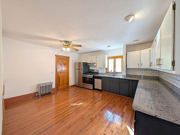 Sunny first floor of a three unit house. Private entrance! Oversized foyer with huge coat closet and large windows in the living room. Formal dining room with bay window. Large modern eat-in kitchen with granite counters with plenty of room for a large dining table. Both bedrooms are large with AMAZING closet space. Updated tile bathroom. Hardwood floors and ceiling fans throughout the unit. Laundry machines are free and dedicated to the unit just outside the back kitchen door. Storage is available in the basement and there's a cute back porch to enjoy the nice weather. Cats ok. Available for immediate move in.