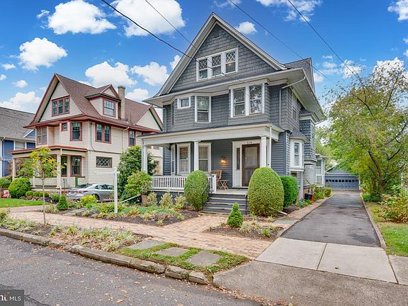 This 5 bedroom, 2.5 bath Victorian home in the heart of Haddonfield awaits you! Built in 1910, this home provides the charm of original hardwood floors, stained glass windows and high ceilings throughout all three floors. A welcoming front porch leads you right inside to the living room complete with a gas fireplace. The enlarged dining room boasts of a bay window and flows into the kitchen. The kitchen highlights exposed brick, an island complete with marble countertop, subway tile backsplash, eat-in breakfast area and a large pantry. Double doors with stained glass detail lead to the sunken family room; complete with sky lights and a wood-burning fireplace. On the 2nd level, you will find the primary bedroom, two additional bedrooms, full bathroom and a walk-in cedar closet. On the 3rd level, there are two bedrooms and a full bathroom with soaking tub! There is a fully-planked attic with pull down stairs. An unfinished walk-out basement provides an abundance of storage and an area for laundry. The two car detached garage is in AS-IS condition. This location is walkable to schools, restaurants and shops in Downtown Haddonfield. The PATCO station provides an easy commute to Philadelphia if needed! Seller is providing a one year home warranty with the purchase of the home. Seller is also looking for a Spring 2025 rent-back.