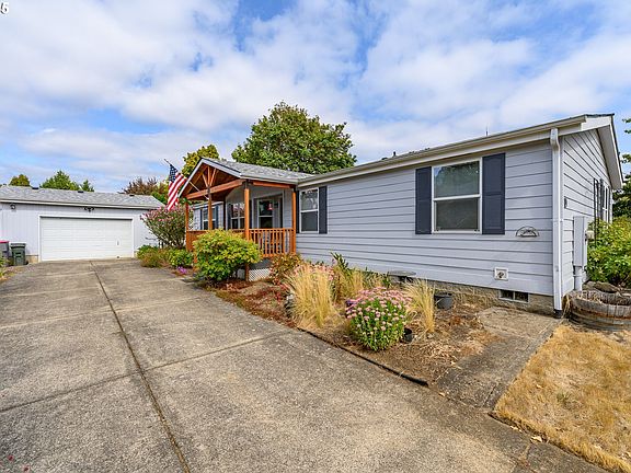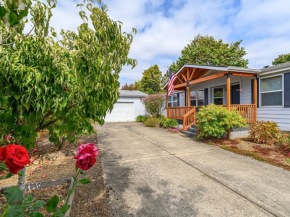 Lovely manufactured home on it's own .20 parcel. Timber framed front deck adds to the charisma of this lovely home. New roof in 2021. New furnace and heat pump in 2023. No HOA! Well maintained and ready for its new owners, you will love the floor plan with 3 beds/2 baths, living room and family room. Detached 2 car garage with long driveway allows for multiple cars to park. The backyard has been transformed with paths, flowers, bushes and garden arbors creating a serene and comfortable setting. Fenced yard keeps the pets safe and contained. Priced just right for the discerning buyer.
