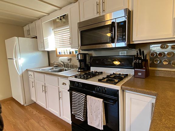 WOW! You'll appreciate the updates in this move-in-ready home! The exterior has updated vinyl siding and windows, 2 sheds (1 is insulated, wired w/ electricity), a large patio slab, dbl driveway and 2 decks (8x14, 8x10). The interior is loaded with charm; newer flooring and paint on SHEETROCKED WALLS; crisp white cabinetry and new countertops and vanities; stylish plumbing and lighting fixtures. All appliances are included. The entry area walks out through patio doors to a deck and nicely manicured fenced yard with elevated garden boxes. Located close to schools/shopping in S Bismarck. Call today, it's a MUST-SEE home! Lot rent $425