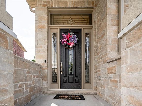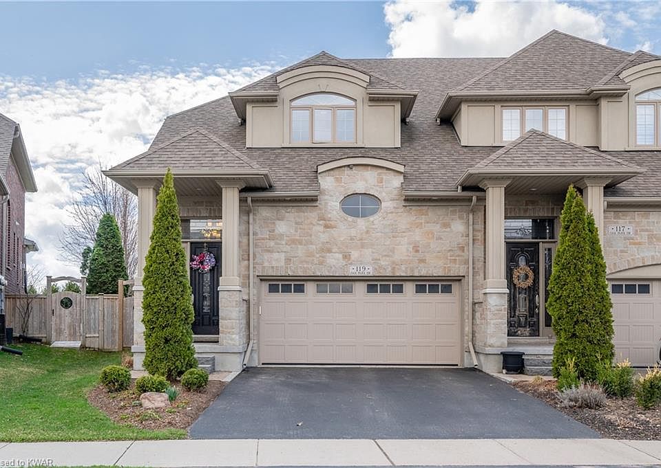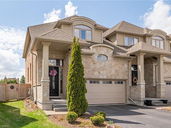 Executive freehold end unit townhome located in the desirable Carriage Crossing Community. Over 2,100 square feet of open concept living space. Fall in love from the minute you step through the front door. Gleaming hardwood floors throughout the dining room, living room and kitchen. Relax and enjoy the warmth from the beautifully tiled natural gas fireplace in your open living room with 17 foot ceilings and automated window blinds. This stunning kitchen offers you a large granite counter top island with built in sink and dishwasher, along with room for 4 bar stools. Matching 4 piece 'Jenn-Air' stainless steel appliances, built-in stove top with range hood, double door refrigerator, microwave/wall oven with convection system. Main floor 2 piece bathroom and separate laundry room with front load washer and dryer and storage cabinets. Make your way upstairs to the primary bedroom and check out the ensuite and 2 walk-in closets! Ensuite features double sinks with granite counter tops, along with a beautiful walk-in shower and 'Caml Tomlin' Jacuzzi tub. 2 additional bedrooms and a 4 piece main bathroom complete the upper level. Your unfinished basement is awaiting your personal touch and includes a rough-in for a 3 piece bathroom. Attached double car garage with automatic door opener and inside entry. Walk-out from the kitchen to your covered composite deck, perfect for barbequing in any weather. Natural gas line set up for BBQ. Backing onto the soccer fields of RIM Park Sportsplex, a state-of-the-art indoor recreation facilities includes four skating rinks, two soccer fields, and two basketball courts is just steps away. Also, the Grey Silo Golf Course, offering 18 holes of golf right in Waterloo is almost in your very own backyard. Not to be overshadowed, there is plenty of other outdoor areas worth visiting, including The Walter Bean Grand River Trail, Kiwanis Park and Bechtel Park.