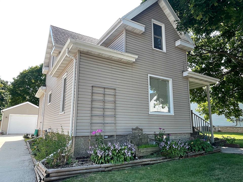 Well maintained 1 1/2 story farmhouse style home. Living room, dining room, kitchen with updated countertop/island and appliances included. Other room can be used as an office or gaming area. Upper level has 4 bedrooms, one which may make a great craft room or office overlooking the back yard. Shed and gazebo included. Sit on deck to overlook the nice back yard. Detached vinyl garage to finish off. All offers being presented on Wed Sept 6, 2023 at 2:30pm.