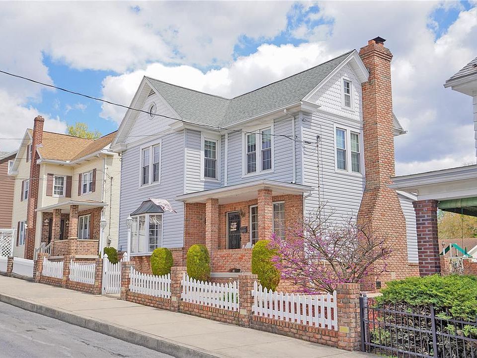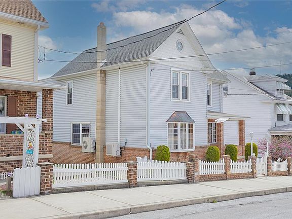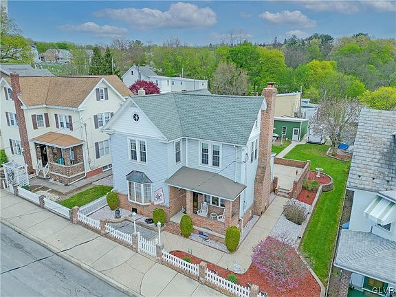 Multiple Offers Received. Highest and Best by 4/29 @ 2 PM. Located on quiet Dutch Hill in Tamaqua, this home offers ample space while showcasing extraordinary masonry detail. From a brick and white picket front fence, the outdoor spaces continue to thrill with thoughtful foliage and intricate hardscape. A covered front porch opens to a spacious, open-concept living-dining room with stunning brick feature wall surrounding a wood burning fireplace with custom glass screen. A dedicated home office offers attractive and useful built in bookcases and cabinetry. To the rear, spacious eat-in kitchen with ample workspace and a mud room with half bath. Upstairs, three large bedrooms and updated hall bath with bonus walk-in closet offers an abundance of thoughtfully designed built-in storage! Accessed via the living and mud rooms, a concrete patio is surrounded by exquisite custom brick walls leading to a flat yard with shed and oversized two-car garage.