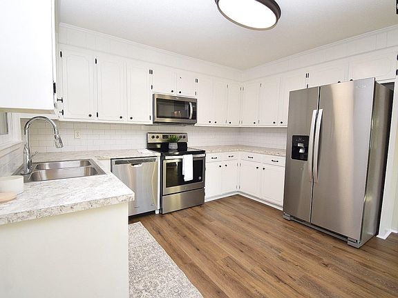 - Kitchen: Counter Tops-Formica, Eat In, Cabinets-Stained, Floors-Laminate, Backsplash-Tiled