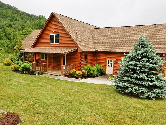 Stunning Log Home in scenic upper Crabtree area with year around mountain views and a stream. Huge 2 story great room with floor to ceiling prow windows, split design covered rear porches w/ tranquil mountain views, Floor to ceiling stone fireplaces in great rm and master bedroom, 2 masters on main level, jet tub, kitchen has stainless steel appliances, granite, walk in pantry and granite window ledge. Upstairs has 2 BRs/1BA, loft area, storage closets and flex office room. 3 horses allowed.