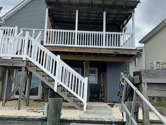 3bdrm, 3bth Cape Cod waterfront raised modular home on pilings overlooking lagoon with 50' vinyl bulkhead and dock. Easy bay access within minutes and great views. Open floor plan kitchen with 42" cabinets and granite countertops, and pantry/closet spacious dining area and living area with hardwood floors. Master bedroom with 2 walk in closets and full bath with shower as well as another office/den/extra room, second full bath and laundry room. Second floor has two large bedrooms with closets with plenty of storage space, full bath and open area for any use. Main floor has central air. Second floor has mini-split air system and home is equipped with an instant hot water system. Enclosed lower level has full size garage door as well as separate door entry. Extra parking space, large workstation and tons of storage. Home being sold as is. We welcome realtors to show interested buyer's.