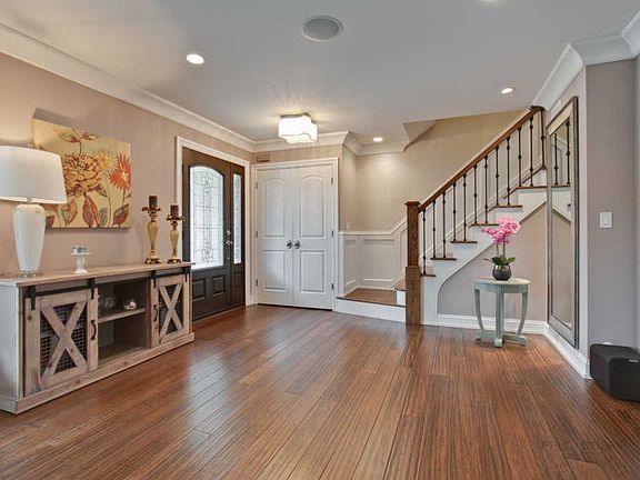 Impressive finishes with a designer flair!Walk to downtown, parks,pool,train,schools & shopping.No expense was spared with trending white center island kitchen featuring 42" custom designed cabinetry,satin finish granite counters & backsplash, Bosch SS appliances including beverage cooler. Gorgeous & elegant baths featuring Calcutta marble, Quartz counters, Grohe fixtures, showers with body sprays and rain heads. Family room off kitchen appointed with coffered ceiling, limestone fireplace, custom built-in entertainment center. Master bedroom features a serene balcony overlooking the spacious backyard, new lush carpeting and replaced closet doors. 3.4' wainscoting in dining room, stairway, hallway, and master bedroom. 6" trim and 7" crown molding. Dazzling crystal chandeliers and pendants, recessed lighting, built-in speakers, hardwood floors. Completely finished basement + office with built-ins. New James Hardie siding 2012. New furnace 2012. New Marvin windows and doors 2012. Upgraded 200 AMP electrical 2014. New A/C 2016 + more