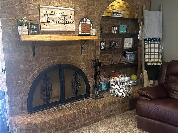 This beautiful home is a semi-open floor plan with many recent updates! It is handicap accessible with a step-in shower in the primary bathroom. It is conveniently located next to a cul-de-sac and the driveway is large enough to hold as many as 6 cars. There is a large covered entrance and a lovely enclosed patio. A beautiful picture window in the front and large oversized rear windows allow natural lighting into the home. The living area is accented with a beautiful wood burning fireplace and built-in shelves. Both bathrooms have recently had renovations. The spacious garage also has a work room attached. All bedrooms are large in size. Come fall in love with this beautiful home! Please call Elizabeth James at 580-699-9651 to view it now!