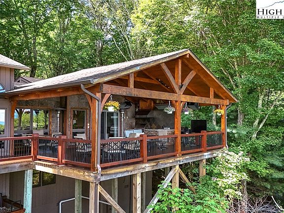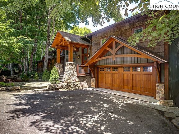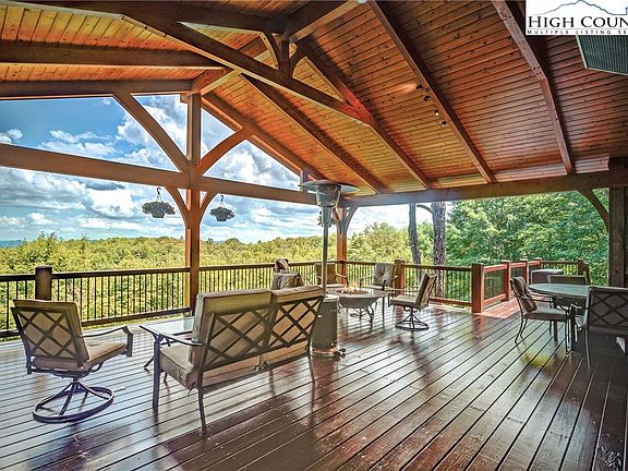 Own this gorgeous home now just in time for ski season, and there's plenty of room for all your friends! Perched at over 4500 feet in elevation, this gem is nestled in the scenic Grassy Gap community, nearby the Beech Mountain Club. "Stillness of Soul" combines the charm of a grand, old-fashioned lodge with all the modern conveniences needed for entertaining. Upon entering the foyer, you'll be mesmerized by the panoramic view of the Blue Ridge mountains through a wall of windows. The dining room features a striking large twig chandelier. Passing through the aspen log threshold, you'll find a well-appointed kitchen with all new appliances and a den with a floor-to-ceiling rock fireplace. Glass doors open to a spacious covered deck where you can enjoy the stunning view. This level also hosts a secondary primary suite and bath just off the den. A short flight of stairs on the other side of the house leads to the primary suite, featuring more windows that flood the room with natural light and breathtaking views. This suite includes a luxurious primary bathroom and a custom-built closet. The home's design ensures privacy with thoughtfully spaced living areas. The downstairs area boasts a large media/game room, a secondary kitchen, a half bath, and another fireplace, which make for cozy evenings after skiing. This room also provides access to another deck with a hot tub to enjoy the expansive views. On the other side of the home downstairs, you'll find a bunk room, another large bedroom, a full bathroom, ample storage, and a laundry room. There's also access to a fenced yard for your pets. The home is sold furnished with over $100,000 worth of high-end and custom furnishings and decor. Short-term rentals are permitted. Just 5 minutes to Beech Mountain Ski Resort, This would make a perfect rental. Don't miss out on this amazing home! Rental Projection from Carolina Cabin Rentals is $80K-$105K.