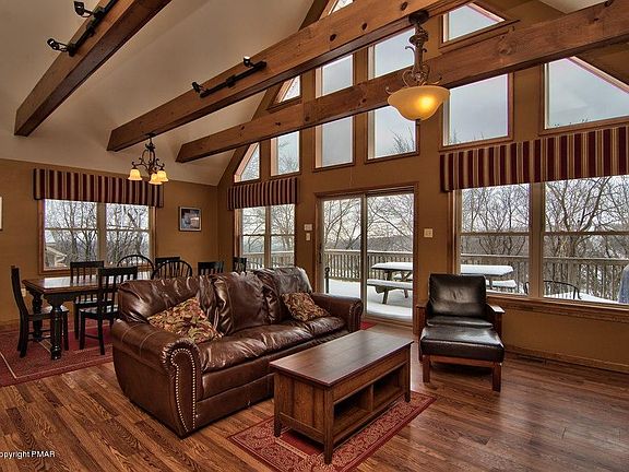 BEAUTIFUL LAKE HARMONY ESTATES! Enjoy all the seasons from this custom built contemporary home offering 6 bedrooms, 3 full bathrooms, living room with a gorgeous double-sided, stone-faced fireplace, and nice views of the mountains and Big Boulder Ski Resort. The lower level provides a large family room with a stone-faced fireplace, laundry area, 2 bedrooms, and a full bath. The second level offers a foyer/den which shares the double-side fireplace with the living room, 2 bedrooms, a bathroom, kitchen with granite counter-tops, and large dining room. The third level has another 2 bedrooms, a full bath and a large loft with an amazing view. This home has great rental history! More features include, hot tub, patio off of the family rm, central AC, forced hot air, SS appliances & much more!