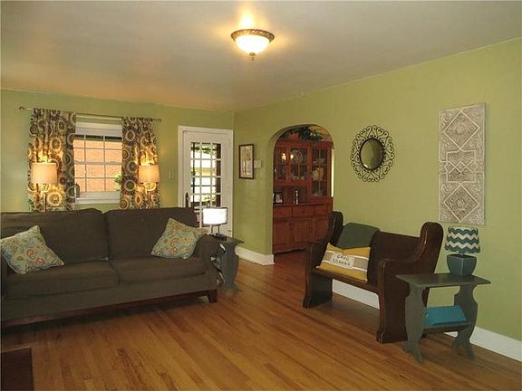 Sun-drenched and loaded with character, this brick beauty has so much to offer! A decorative stone fireplace is the focal point of the bright living room with exposed hardwood floors, plenty of windows for natural daylight, and access to covered side porch that's perfect for morning coffee or just people watching. A formal dining room is open to a beautiful and well-planned fully-equipped kitchen with island -- plenty of workspace and a wall of pantry storage! 3 nice-sized bedrooms and an impeccable retro bathroom complete the second floor. The semi-finished basement is huge, presently set up with a gameroom area and an office "nook." A bonus is more custom-built storage as well as a walk-in storage room. Just bring your furniture.