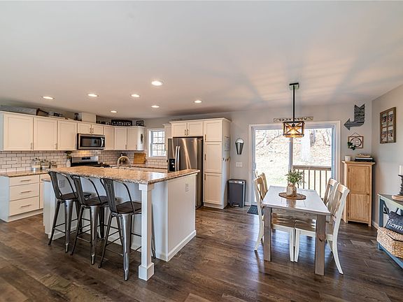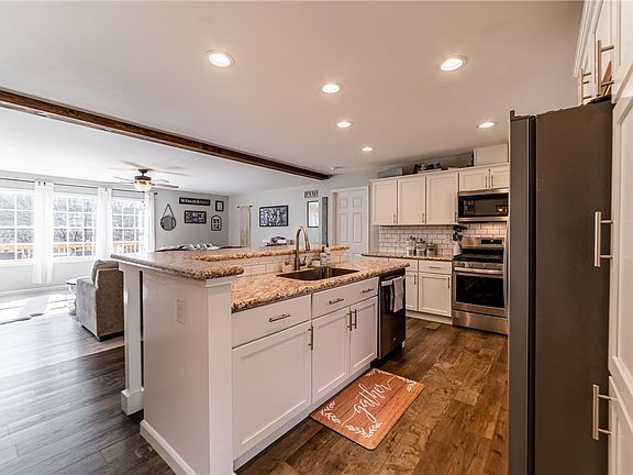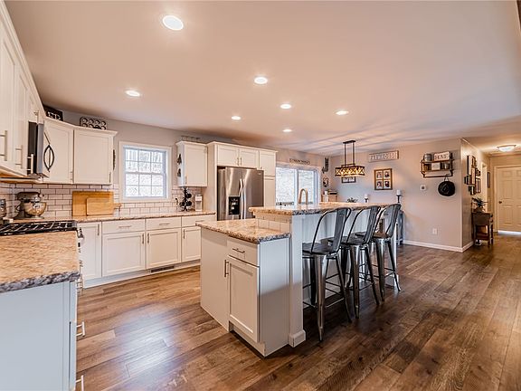 This beautiful ranch home was built in 2018 and sit on just over an acre of property in Karns City School District. You'll be wowed when you enter the open concept main living area which includes new LVP flooring, a kitchen with white shaker cabinets, SS appliances, an island with breakfast bar, and subway tile backsplash. There's an abundance of natural light throughout. The 18x16 primary suite includes a private balcony, a spacious walk in closet, and a large ensuite with a soaker tub. The owner spared no expense in upgrades including a gorgeous 1200 sq ft finished basement with a custom bar area, bonus room (currently used as a 4th bedroom), a family room with a projector and large screen - perfect for those movie nights, a partial bath with plumbing to add a shower, and a garage with plenty of storage and work bench. The exterior has great curb appeal with brick finishes, large decks, and plenty of space for outdoor activities. This one is a must see!