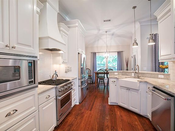 Buyers will be lined up to see this one! This home sits on the first cul-de-sac as you enter the neighborhood(easy access to get in and out) and has a private backyard that has a hedge of tall trees for privacy. You will be hard pressed to find a kitchen this nice with features including upgraded stainless steel Viking appliances, slab granite countertops, subway tile backsplash, farmhouse sink, breakfast bar and upgraded lighting fixtures over the bar. The living room has a center fireplace with a brick surround, built-ins cabinets on both sides of fireplace, wood floors and beautiful thick wood beams. The master bedroom has trey ceiling and designer paint colors with the master bathroom has subway tile countertops, separate shower, whirlpool tub and a walk in closet. the backyard is a major selling feature with lots of privacy, sprinkler system, and a covered back patio. Just to say it again--you better call you favorite realtor because this one will not last