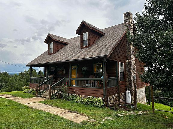 No 025039 Come see this beautiful 1914 sq ft cabin style home in Mountain View, AR with peaceful mountain views and plenty of space to enjoy. This 4 bedroom 2.5 bath home features two stories and a finished basement with hardwood floors throughout. Each level has a bathroom including a half bath in the basement with a toilet and sink. The basement also offers a laundry room and a separate sink vanity in the main area, ideal for guests or added living space. The main living room features a cozy gas log fireplace and warm wood finishes that bring out the cabin charm. Covered front and back porches offer the perfect spots to relax and unwind, with the back porch giving you a beautiful view of the mountains. Solar panels convey reducing power bills to less than $20.00 per month. A 14 x20 shed or workshop is included. Enjoy the concrete sidewalk for easy outdoor access. Whether full-time living or a weekend retreat, this home offers comfort, character, and scenic surroundings in the heart of the Ozarks. $249,000