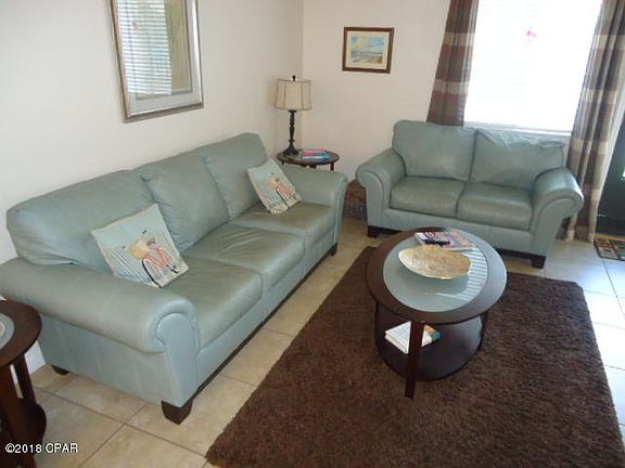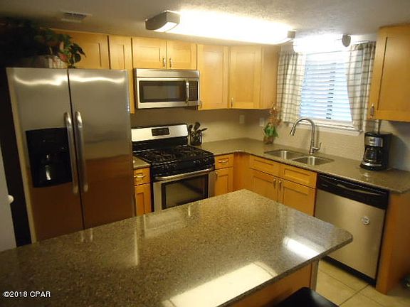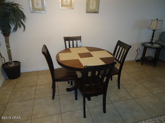 Age, SF, and dimensions approximate. Beautiful unit completely tiled downstairs. Upgraded kitchen with granite counter tops. Stainless steel appliances. Wood cabinets. Tankless hot water heater. Oversized patio backing up to heated pool and shuffleboard. Balcony off master bedroom enclosed. Perfect for bunk room. Gulf Highlands has 11 pools with clubhouse with pool on the beach. Gated community and pet friendly.