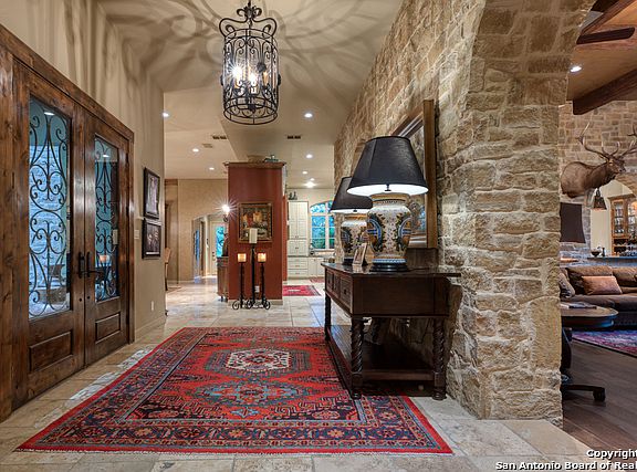 Timeless Appeal designated for this spectacular Hill Country retreat! Perfect for entertaining! Elegantly applied rustic custom materials and colors bring the exterior flavor of this home inside! Masterfully cut limestone embraces the entry, the fireplace mantle in the 15 foot high great groom! Indoor appointments include :Jen-Air 6 burner/gridle with warming drawer, under counter Hoshizaki ice maker, two built in refrigerator/freezers, Kinetico reverse osmosis system with Kinetico water softener, Turkish Travertine flooring, wide plank wood flooring, granite marble counters throughout, large walk-in showers. There are two laundry room area in this home, the main laundry room is downstairs and the secondary is upstairs. Outdoor amenities: well with a three ring cement water storage tank, sprinkler system, outdoor tree lighting. Outdoor covered living entertaining space includes: outdoor U-line beverage center, outdoor kitchen with gas grill, three a/c units, stone cut benches make for great outdoor seating. Home was freshly painted in 2017. This lovely home sits positioned for seclusion and serenity, only means of entry is through a privately controlled gate.