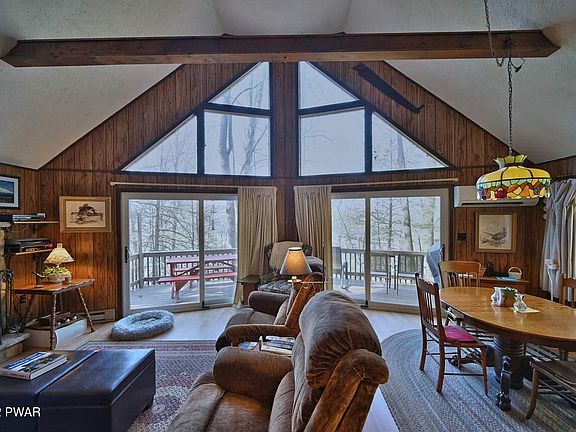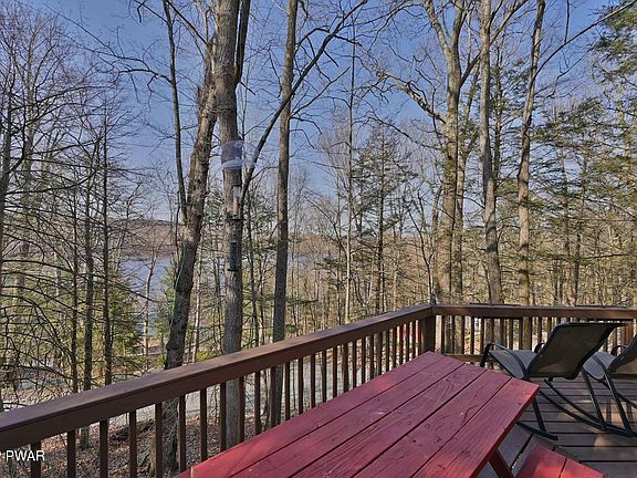 Beautiful Prow-Front Chalet, with seasonal views of Lake Wallenpaupack. 4 bedrooms (one being used as an office), 2 baths, working wood fireplace, hot tub and large two car garage. No association, (optional) and no boat slip - one could be available through Ironwood Point campground. Full finished basement. Sold furnished., Beds Description: 2+Bed1st, Beds Description: 2+BED 2nd, Baths: 1 Bath Level 1, Baths: 1 Bath Level 2, Eating Area: Dining Area